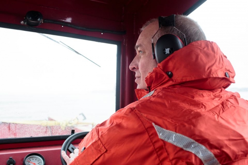 Muskegon Fire Lt. Todd Rake drives the department's new 20-foot flat-bottomed air boat during training on Muskegon Lake in Muskegon, Mich. on Friday, Feb. 23, 2018. It replaces a small hovercraft that is in disrepair previously used for ice rescues. The $67,500 air boat is larger, meaning multiple people can be rescued at once and can even hold ATVs or other cargo.